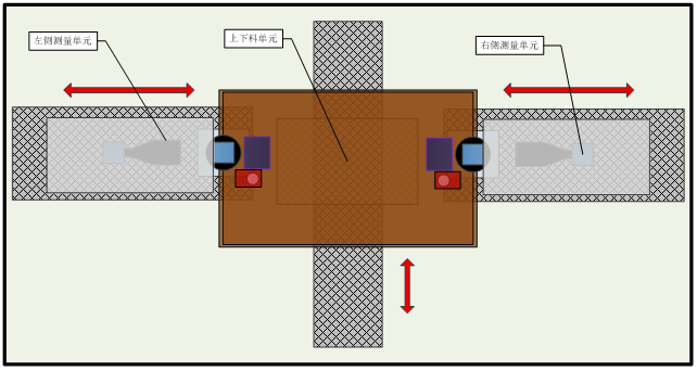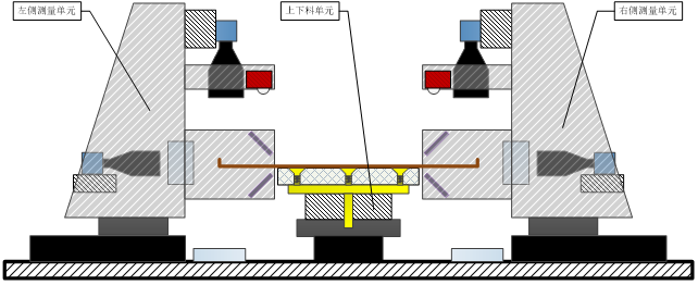 如上圖所示,改測(cè)量系統(tǒng)包括左側(cè)測(cè)量單元、上下料單元和右側(cè)測(cè)量單元三部分,其中左右側(cè)測(cè)量單元可進(jìn)行X方向電動(dòng)控制,以保證對(duì)不同測(cè)量?jī)?nèi)容時(shí)可精確定位;上下料單元具備Y方向電動(dòng)控制和R軸轉(zhuǎn)動(dòng),Y軸進(jìn)給運(yùn)動(dòng)實(shí)現(xiàn)對(duì)整條邊的測(cè)量,R軸轉(zhuǎn)動(dòng)可實(shí)現(xiàn)對(duì)四條邊的全檢測(cè)。