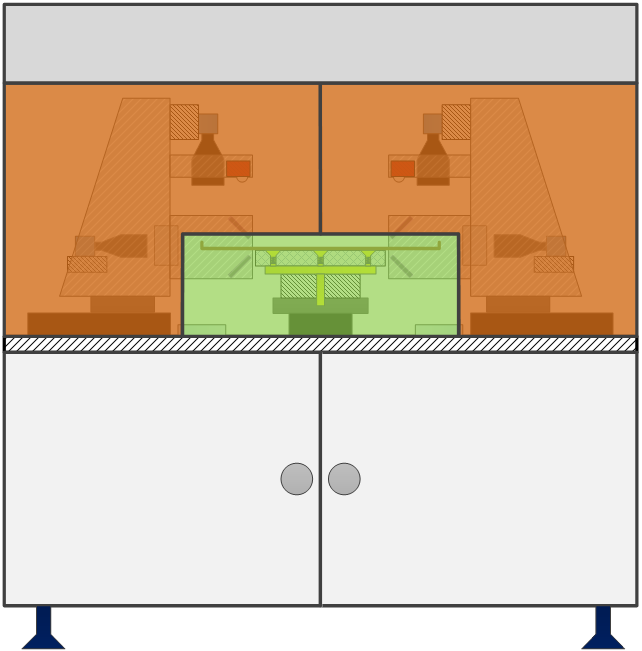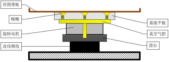 如上圖所示,為了把背板展平采用陣列吸嘴把背板吸附在基準(zhǔn)平板上,這樣可盡量減少背板變形對(duì)測(cè)量精度的影響,同時(shí)治具帶著待測(cè)背板實(shí)現(xiàn)Y軸方向進(jìn)給和R軸旋轉(zhuǎn),保證對(duì)背板各個(gè)尺寸和位置的測(cè)量。