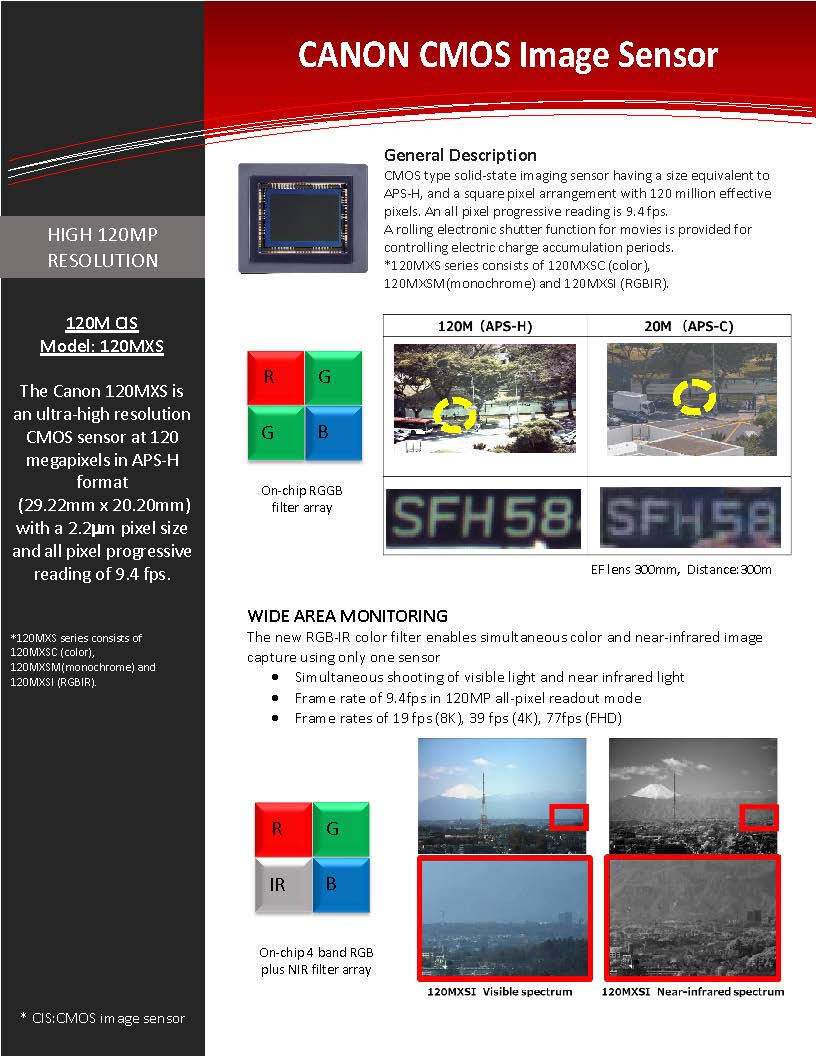 The Canon 120MXS is an ultra-high resolution CMOS sensor at 120 megapixels in APS-H format (29.22mm x 20.20mm) with a 2.2μm pixel size and all pixel progressive reading of 9.4 fps.