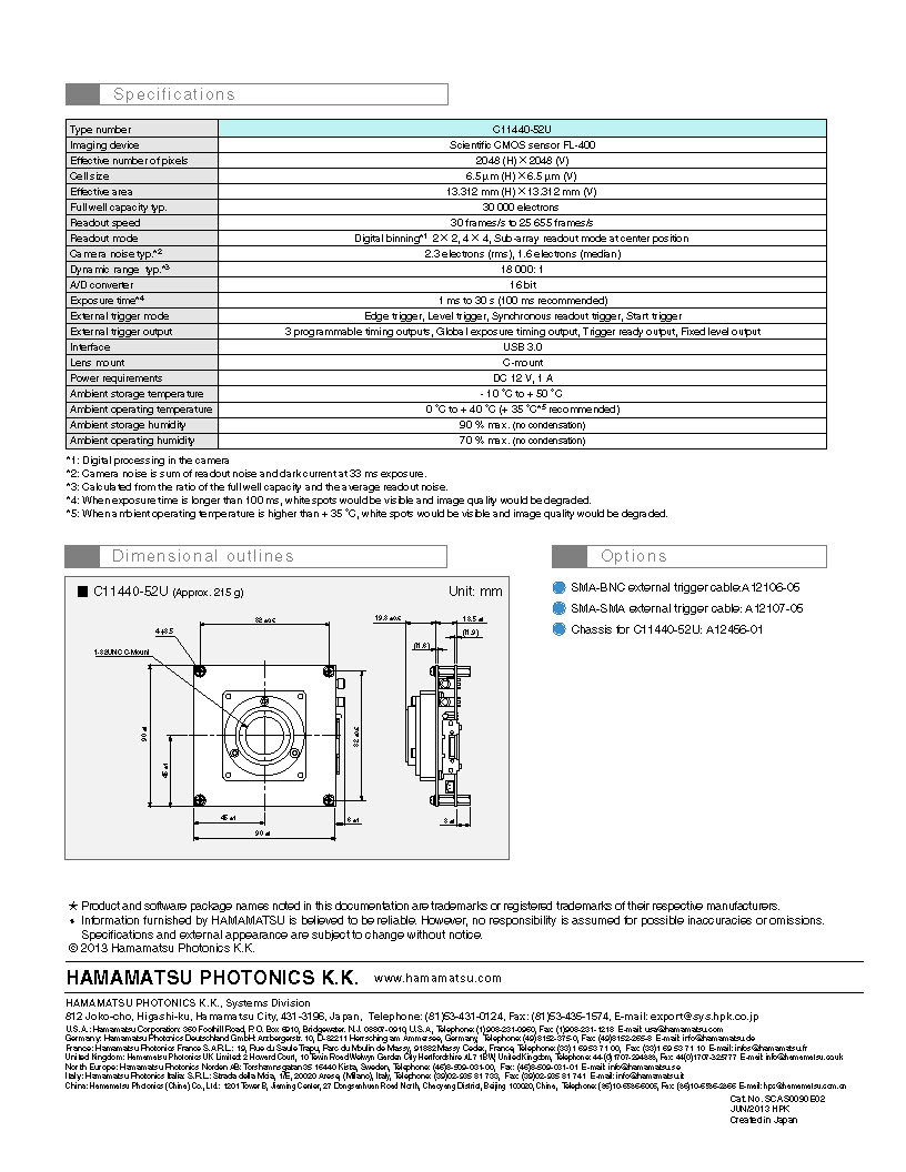 The C11440-52U has low camera noise of 2.3 electrons (rms) at 30 frames/s. Compact (90 mm × 90 mm) and light weight design is considered to be built into various measurement and analytical instruments. In addition to that the camera has USB 3.0 interface for convenience.