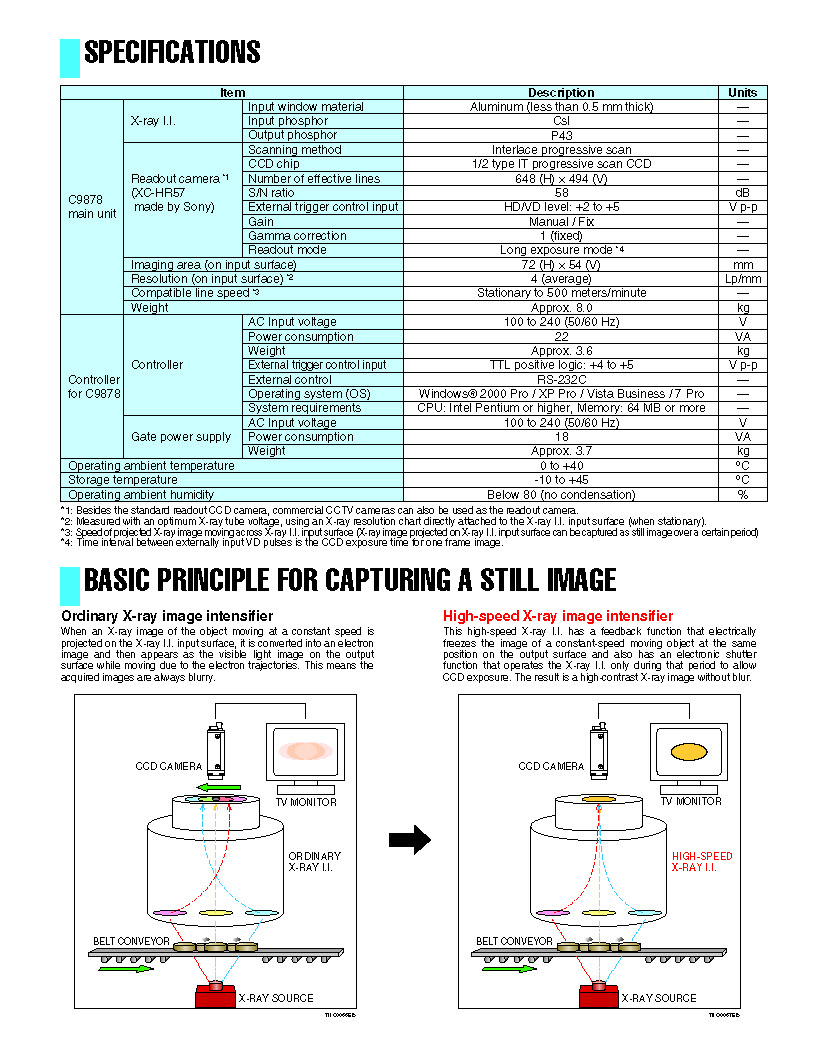 Captures objects at speeds ranging from stationary to 500 meters/minute (on X-ray I.I. input surface)