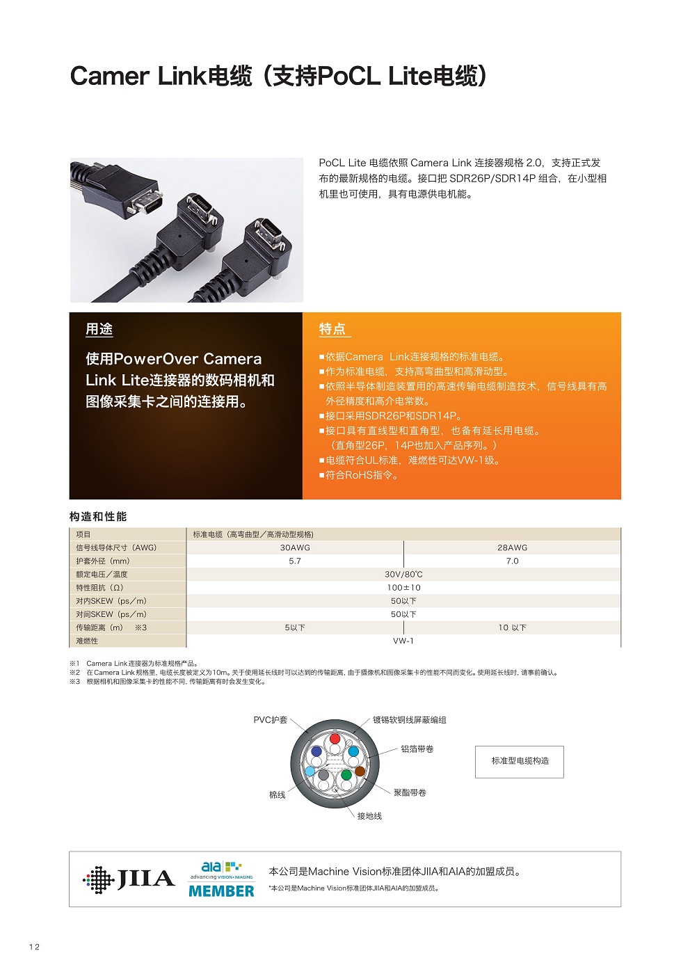 PoCL Lite 電纜依照 Camera Link 連接器規格 2.0,支持正式發布的新規格的電纜。