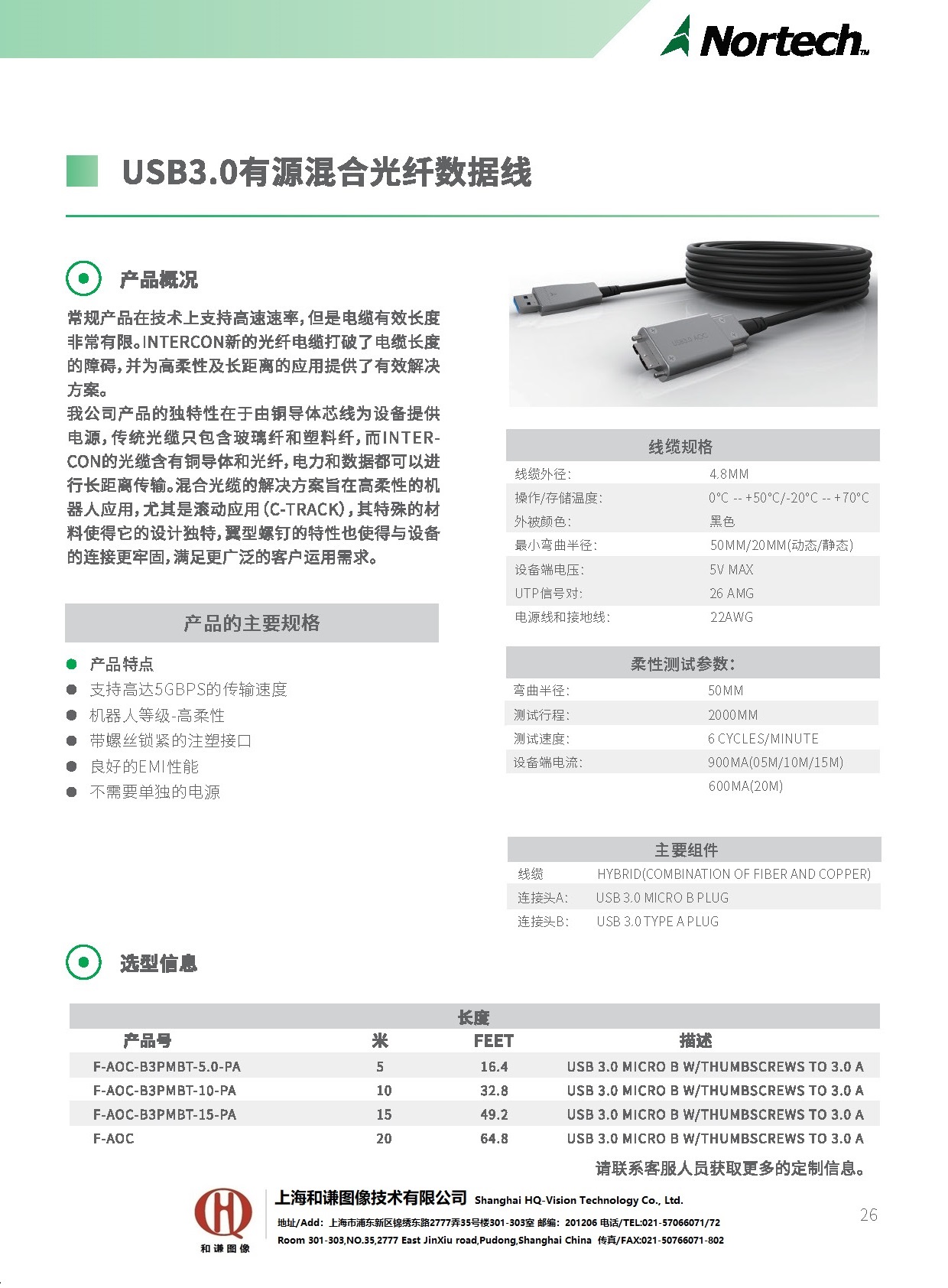 為了彌補普通 USB3.0 有源光纖數據線無法給設備供電的缺陷,北科推出了新一代的 USB3.0 有源混合光纖數據線(U3HC)。在采用光纖作為傳輸介質的基礎上,集成銅纜以達到給設備供電的目的。目前在不增加任何中繼設備的情況下,混合光纜長度可達 20 米,非常適用于不具備現場供電能力的應用場合,比如機器視覺領域,遠程監控領域等。