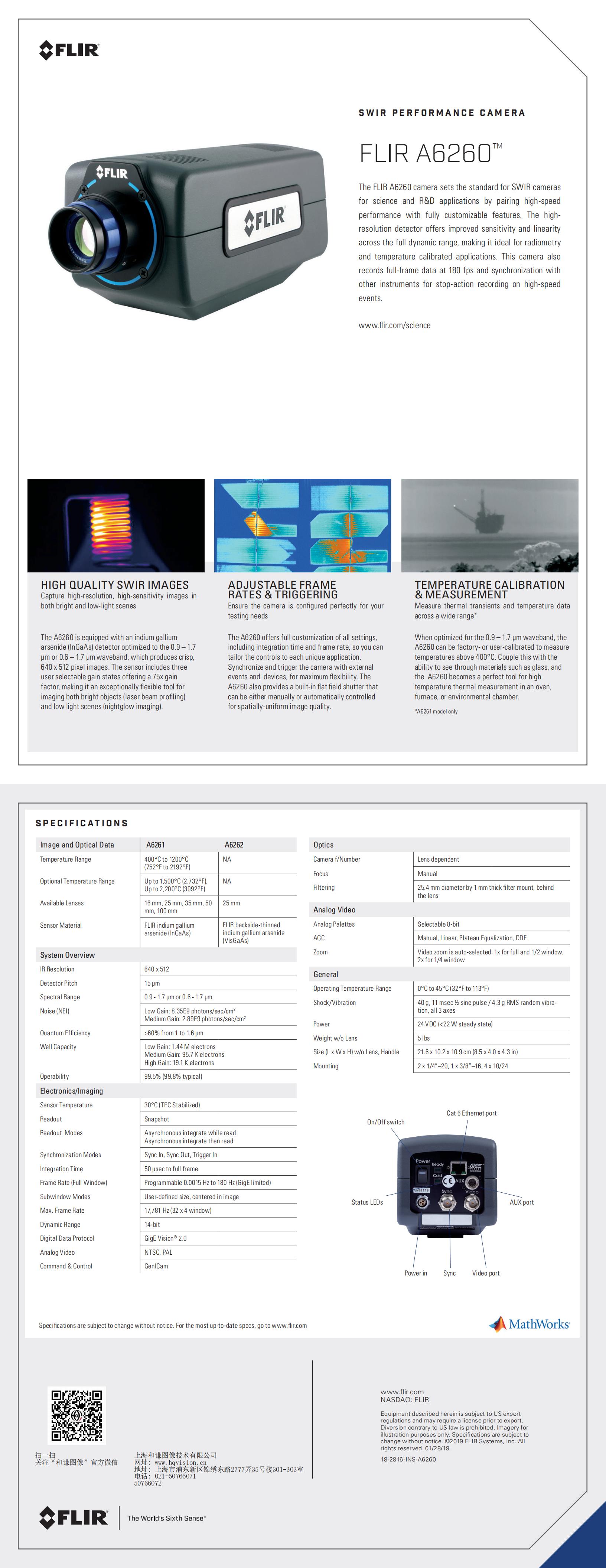 FLIR A6260短波紅外熱像儀具有出色的靈敏度和寬動態范圍,而且可靈活定義窗口模式和積分時間。InGaAs熱像儀在0.9-1.7μm感應波段具有極強線性,使其成為高溫熱測量和要求透過標準玻璃進行測量的應用的理想工具。A6260允許對積分時間等設置項進行控制,同時使您能夠同步和觸發外部事件和設備。